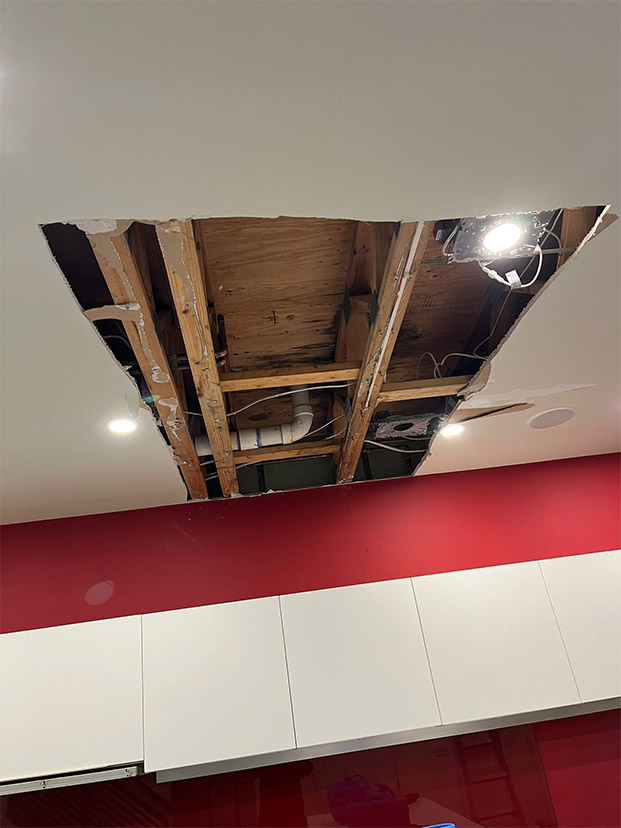 - Surgical demolition: we removed wet ceiling drywall and a partial wall section in the kitchen to open the cavity and prevent moisture entrapment. Straight, clean edges simplified the future rebuild.